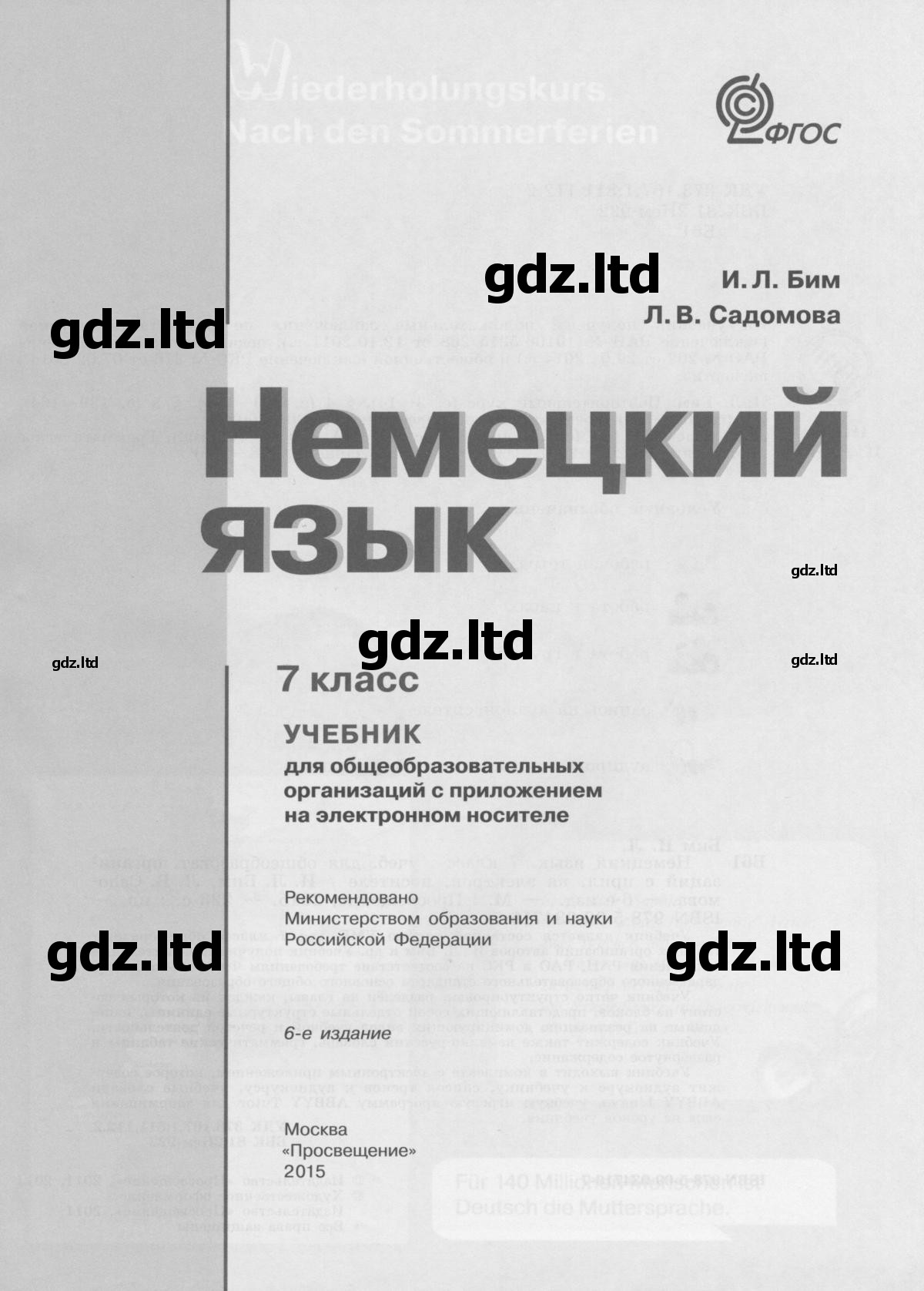 В настоящее время обучение в школе не предусматривает повтора материала, поэтому учащимся приходится с первого раза усваивать всю необходимую информацию. Если же этого не произошло, то получившийся пробел будет доставлять весьма ощутимый дискомфорт, который со временем лишь увеличится. И если с устными навыками еще можно как-то сориентироваться, то вот грамматику будет весьма трудно нагнать. Чтобы не возникало неприятных ситуаций, необходимо сразу же разрешать все непонятные моменты. Отлично с этим поможет решебник к учебнику "Немецкий язык 7 класс" Бим, где подробно описаны все нюансы упражнений, что способствует лучшему пониманию и запоминанию материала. "Просвещение", 2015 г.